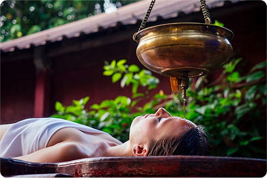 A calming treatment where warm herbal oil is poured gently onto the forehead